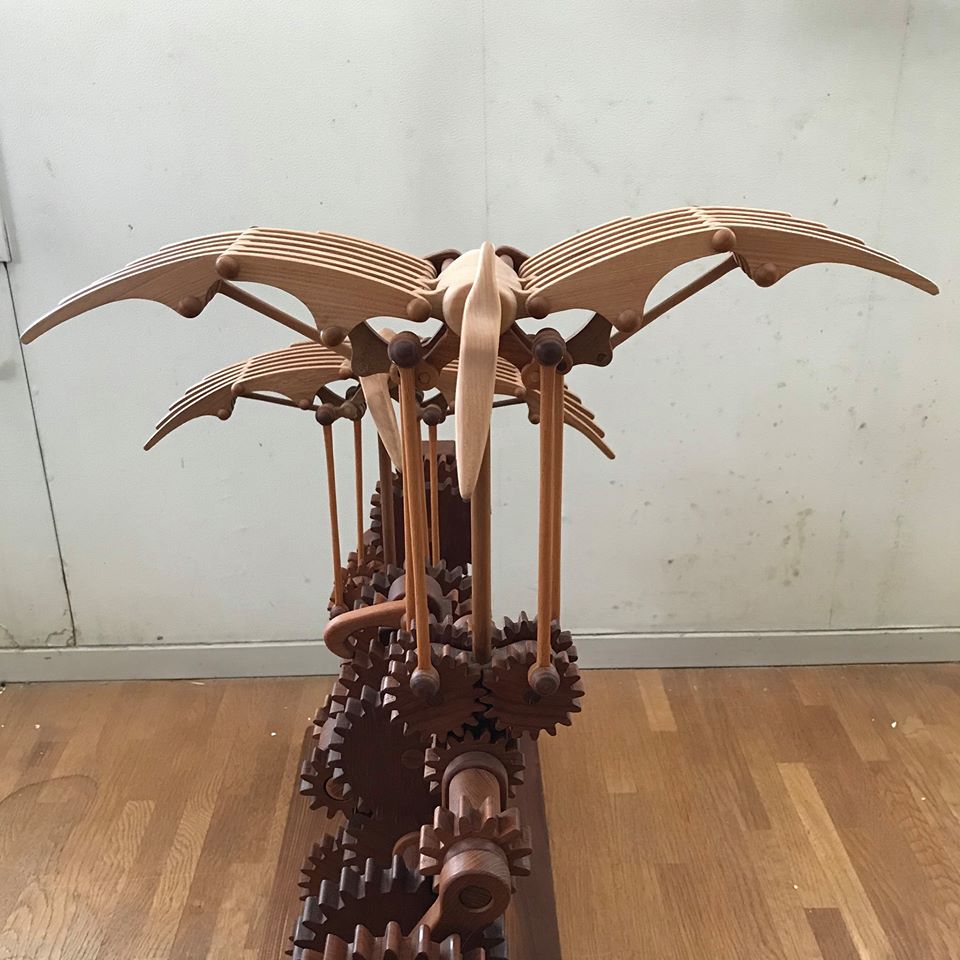 Akira Murakami ist ein bekannter japanischer Künstler mechanischer Holzobjekte. Hier ein in Design und Bewegung äußerst elegantes Paar von Flugsauriern der Kreidezeit (Pteranodon), welches sich mit einer Handkurbel animieren läßt. Das Video ist in Murakamis Instagramseite anschaubar: https://www.instagram.com/akira2020a/