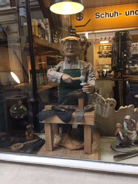 Die Schusterwerkstatt von S.Ölke in der Bonner Friedrichstraße feiert in diesem Jahr 100-jähriges Bestehen. Das war der Anlaß, dieses seltene Stück mechanischen Blickfangs in das Schaufenster zu nehmen. Wie schon in dem vorherigen Kapitel erwähnt, hatten diese Werbeautomaten ihre Hochzeit in der ersten Hälfte des 20,Jahrhunderts. Leider war der Schuster im Arbeitsstress und hatte keine Zeit für nähere Auskünfte. Aber das läßt sich sicher noch nachholen.