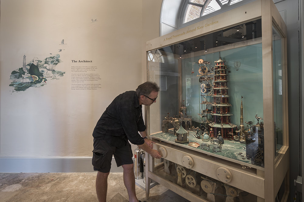 Die große Pagode in Kew Gardens ist ein hoch aufragendes Wahrzeichen der königlichen botanischen Gärten in Kew und wurde als Zeichen der Handelsverbindung mit China im Jahre 1762 eröffnet. Da in dieser Epoche die herausragenden Werke englischer Uhrmacher und Feinmechaniker in China sehr begehrt waren, hat man in Analogie dazu Fi Henshall beauftragt, zwei mechanische Szenenbilder zu bauen, die einmal eine Szene des betriebsamen Hafens in Kanton zeigt, wo Architekt W.Chambers für Studien der Pagoden anlegte  und  zweitens die Pagode in Kew Gardens , wo die Königsfamilie im 18.Jahrhundert lustwandelt.  Das erste Modell ist im obigen Video zu sehen. Es ist zu hoffen, daß vom zweiten Modell noch ein Video folgt. Skellon Studio hat das Design des Infozentrum der Pagode entwickelt und weitere Fotos und Texte  dazu auf seiner Webseite , so auch dieses Foto vom zweiten Modell: