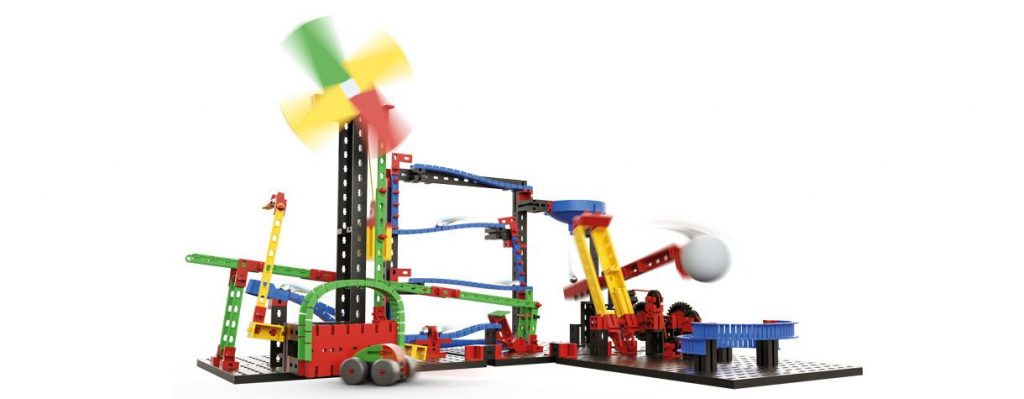 Offenbar unter dem Eindruck der hochkreativen und höchst intelligenten Werke  der jungen „Maschinisten“ der amerikanischen Dominokünstlerszene, über die ich hier schon oftmals berichtete, hat Fischertechnik  dieses Baukastensystem  „Advanced Funny Machines“ herausgebracht: