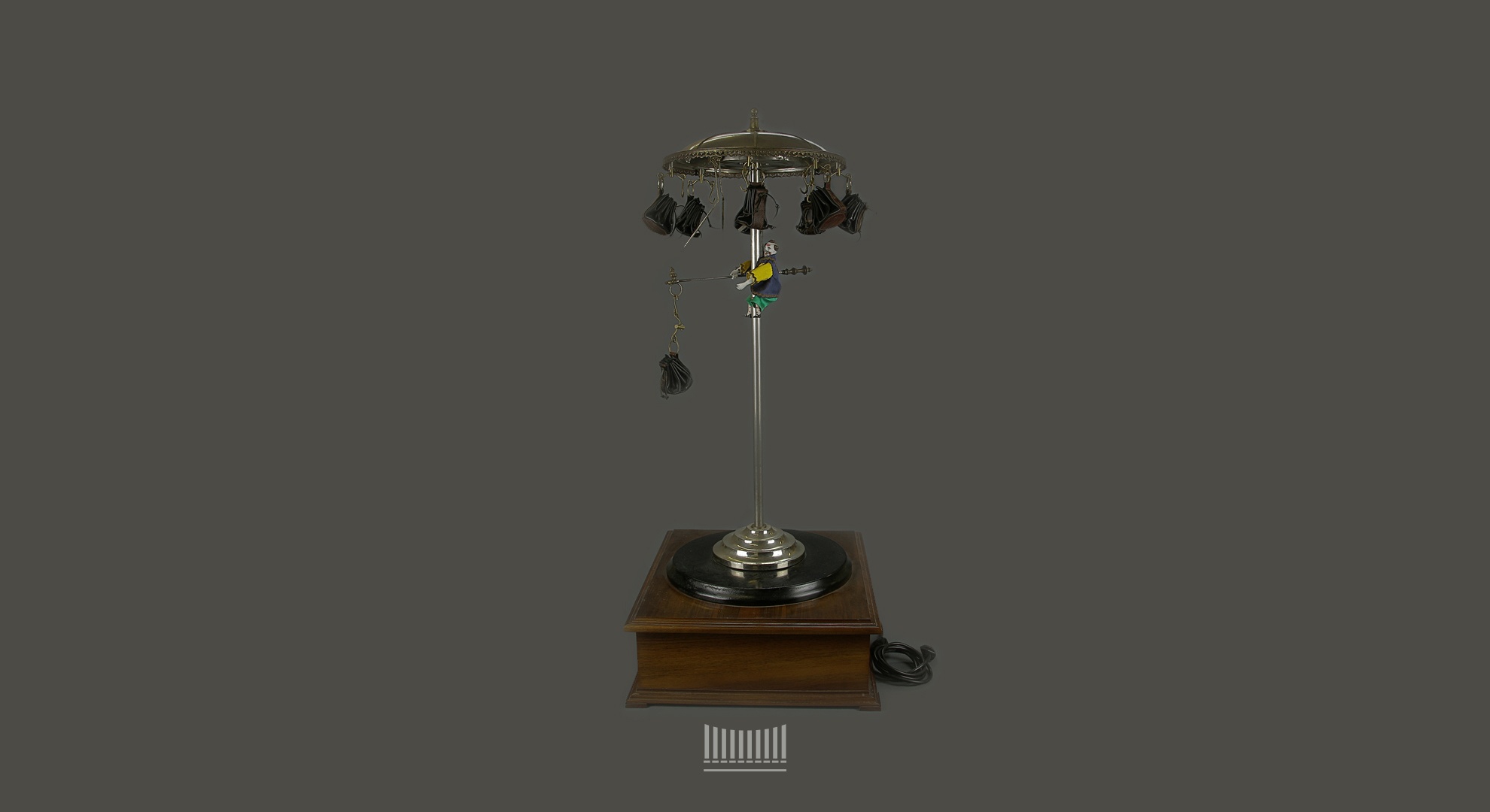 Dieses interessante Glückspielgerät „Climbing Man Picking Pouch“ ist Teil der Sammlung des Sobranie Museums Moskau . Es ist ein etwa 100-jähriges elektrisches Gerät das bei Start eines Spieles eine Figur die Säule heraufklettern läßt und sie zufallsbedingt ein Täschchen aus einem rotierenden Kreis weiterer Täschchen auslösen läßt, das dann herausfällt auf die Gabel des Kletterers, der als Hebel seine Rückfallbewegung startet.Die Säckcheninhalte sind die jeweils variablen Spielgewinne.