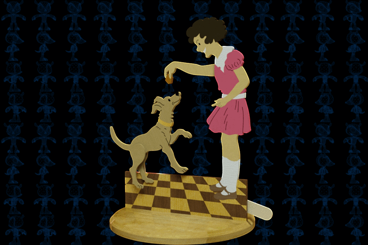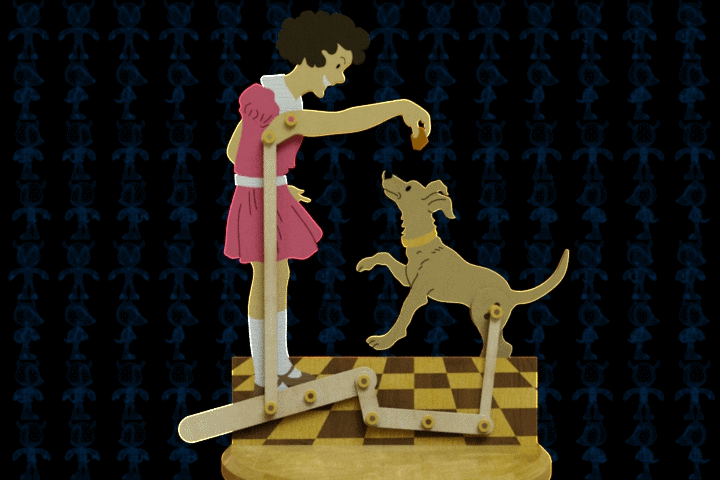 Aus der riesigen Datenbank von GRABCAD : die CG-Graphik eines mechanischen Holzspielzeugs und der animierende Hebelmechanismus auf der Rückseite: