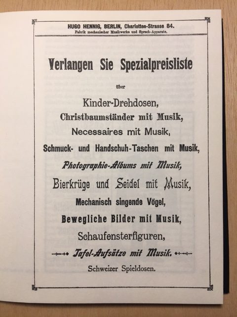 Eine andere Sache: in dem Buch „Drehorgeln“ von Helmut Zeraschi, 1976, fand ich eine Annonce des Berliner Fabrikanten von mechanischen Musik-werken Hugo Henning, o.J., aber schätzungsweise um 1900. Da wurden seine Produkte genannt, von denen mich besonders Bewegte Bilder mit Musik und Schaufensterfiguren (gemeint sind wohl mechanische) interessieren. Ich werde nun mal das Sammlungsarchiv befragen, ob noch ein bebilderter Firmenkatalog zu dieser Annonce existiert.