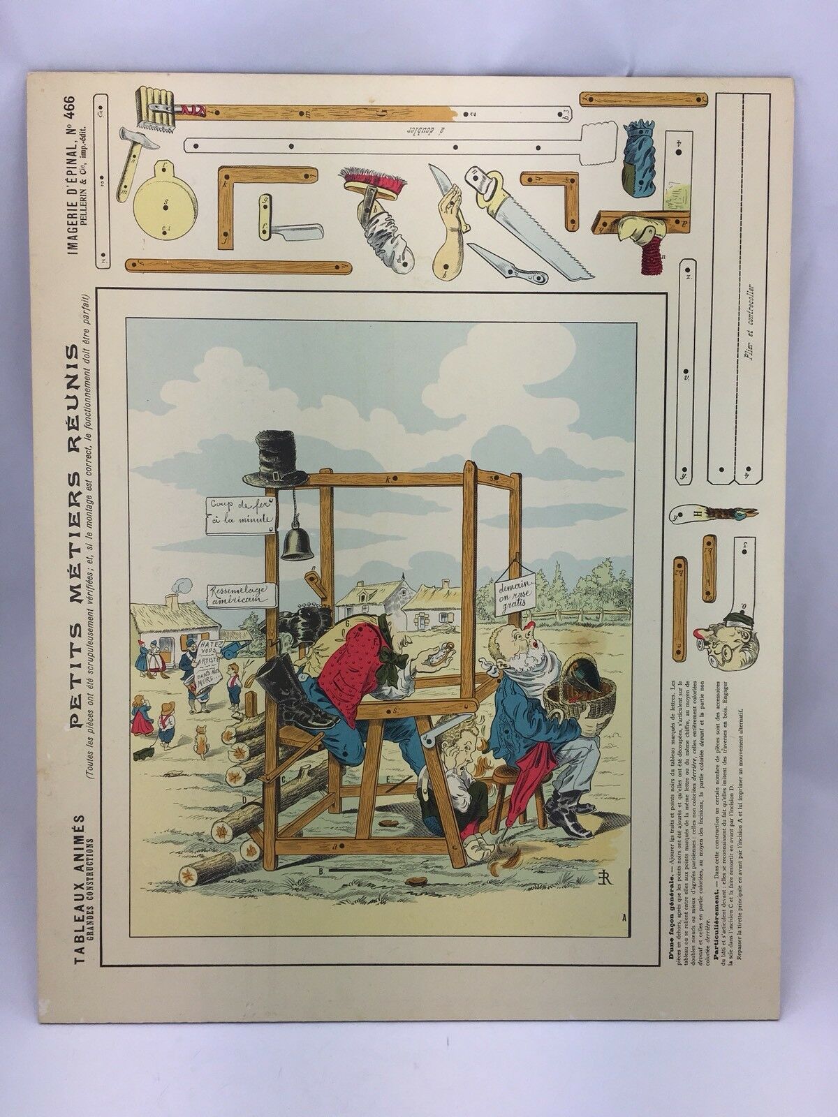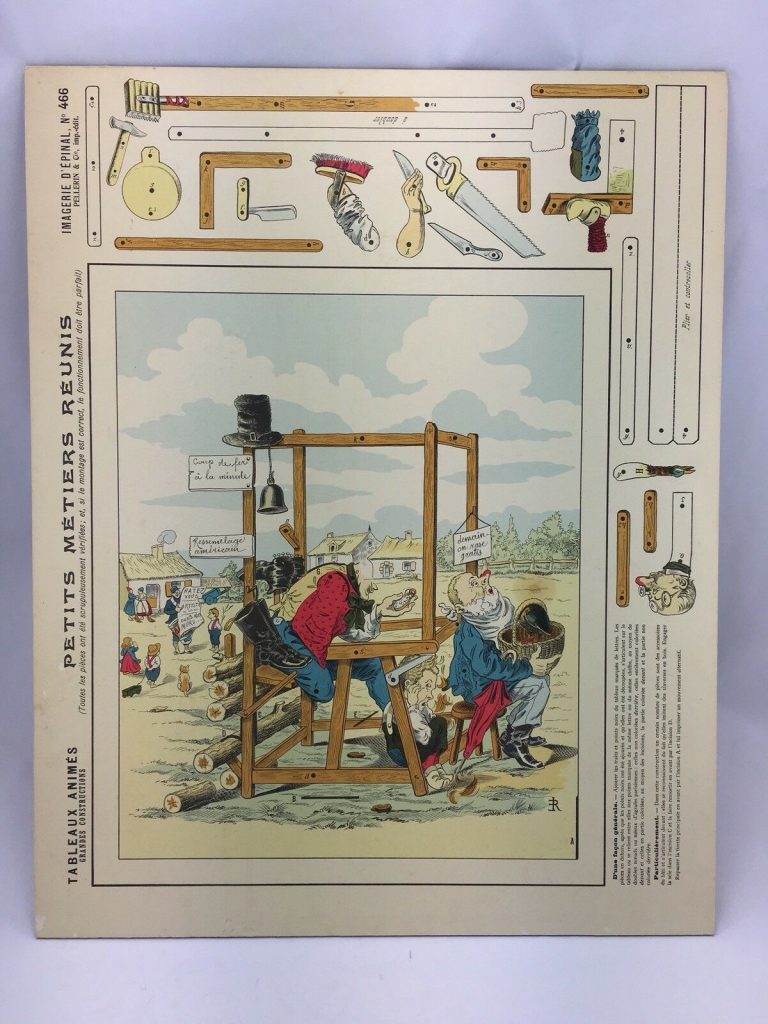 Dieser Ausschneidebogen von Pellerin erschien 1906 und hat den Titel „Petits metiers reunis“ und zeigt einen Scherenschleifer , der sich seine Maschine derart goldbergesk ausgebaut hat, daß er beim Schleifen mehrere andere Handwerke automatisch mit betreiben kann. Das fertig gestellte Objekt kann als GIF in Bewegung gesehen werden in der exorbitanten Sammlung von Larry Seidman, die ich auf einer Plattform LIVE JOURNAL von see_dreams beigesteuert fand . Einfach fast bis Ende scrollen ! https://see-dreams.livejournal.com/240328.html