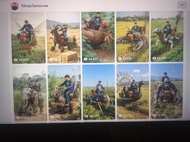 Das ist ein Ausschnitt aus dem Facebookkanal des thailändischen Digital Creator (siehe Überschrift), der diese Kreationen steampunkig ungewöhnlicher Erntemaschinen, jeweils in Tierformen, schuf (Foto vom Monitor)