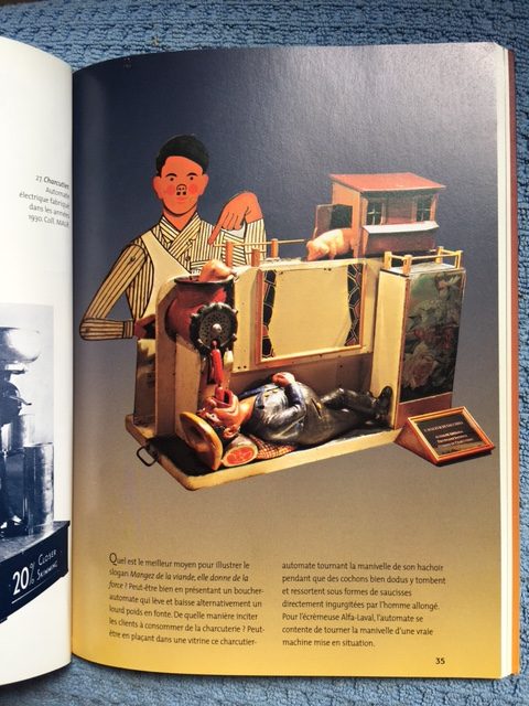 In der sehr zu empfehlenden Monographie zu diesem Thema von Daniel Bordet „Automates Publicitaires“ fand ich diesen skurrilen Automaten, wohl aus einem Metzgerei-Schaufenster, wo die lebenden Schweine in einen Fleischwolf wandern und direkt als Wurst verwandelt in den Mund eines darunterliegenden „Geniessers“ laufen, dessen Kopfkissen auch noch als Schinken dargestellt ist !