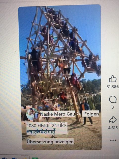 Holzkonstruktion eines Riesenrades, welches durch die Körperkraft zweier Personen angetrieben wird. Das „Rad“ ist hier ein quadratischer Kasten mit eingehängten Gondeln.: Video im Link unten: