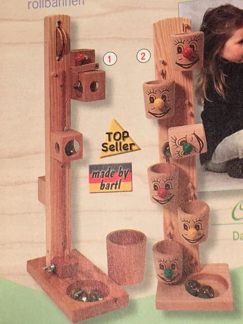 Ich fand vor Jahren ein Spielzeug „Kugellift“ der bayrischen Holzspielzeugfirma BARTL (Katalog 2007), das nach dem gleichen Prinzip funktioniert (linkes Objekt)