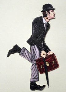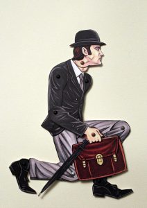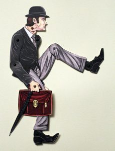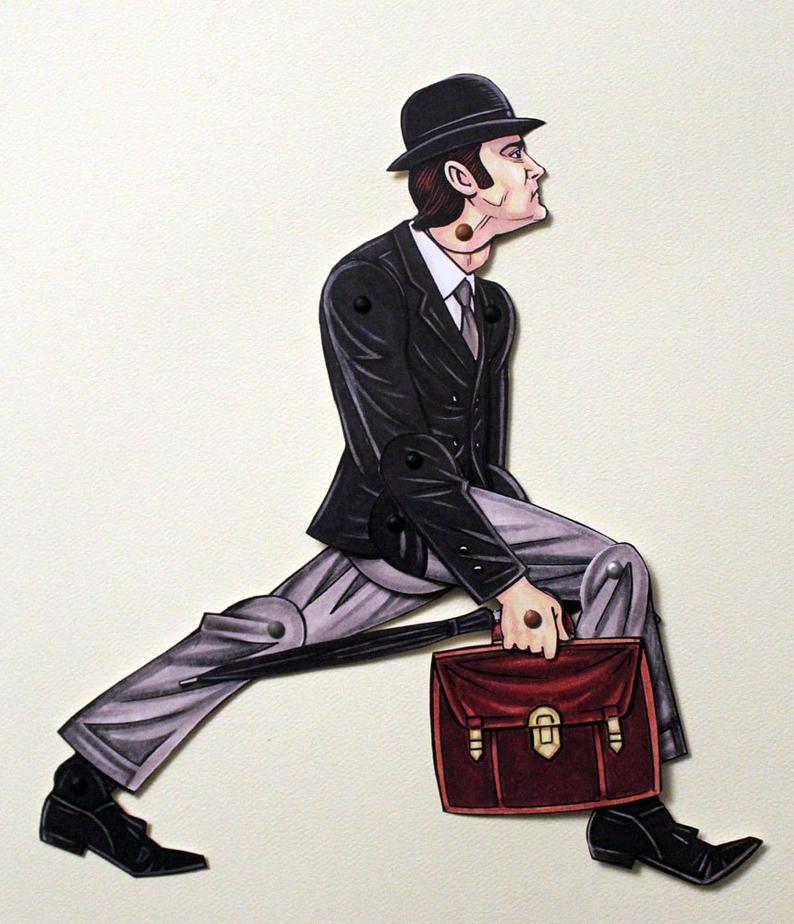 Diese gelenkige Paper Doll bildet John Cleese von den Monty Pythons ab, der in einer Episode von 1970 einen Beamten des Ministry  of Silly Walks (Ministerium für alberne Gangarten) spielt. Die folgende Figur stammt aus dem Etsy-Angebot von Ardently Crafted Paper Dolls  siehe auch hier.