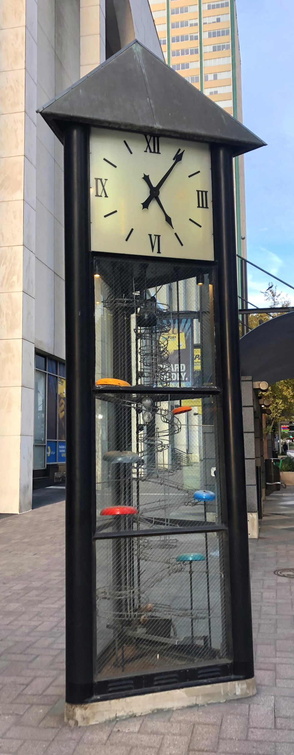 Diese Uhr steht im Zentrum von Dallas und erfreut jede volle Stunde besonders vorbeigehende Kinder , die dem ertönenden „Glockenspiel“ aus herablaufenden Kugeln interessiert folgen. In den 90ger Jahren von Michael Brown entworfen.