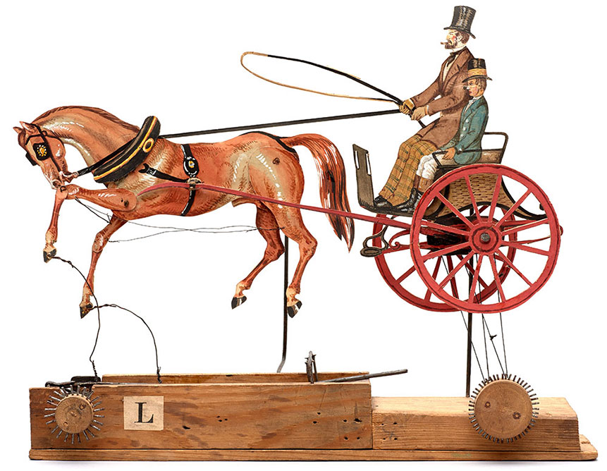 In dem Begleittext der kürzlich beendeten Ausstellung „In den eigenen vier Wänden. Papiertheater – eine bürgerliche Liebhaberei“, Theatermuseum Wien, gibt es eine Abbildung einer mechanischen Figur einer Kutsche, die durch das Scrollen von etwa 70 % des Textes gefunden werden kann und dann bei vorsichtigem Weiterscrollen nicht weiterwandert, sondern auf der Stelle bleibt und in einen Animationsmodus den Pferdegalopp und die Kutschenräder in Bewegung zeigt, was durch den scrollenden Ablauf von 8 Einzelbildern erreicht wird.