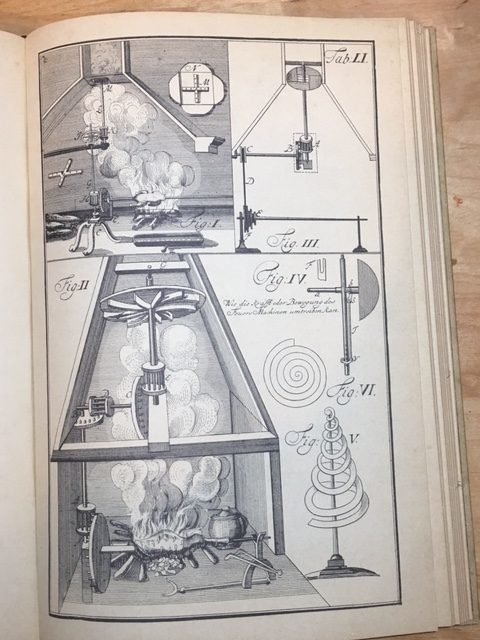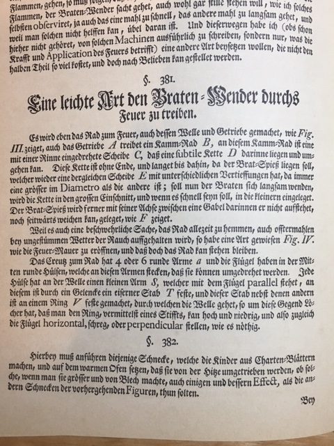Ich habe in früheren Artikeln schon auf diese interessanten Geräte hingewiesen, die meist durch ein Federwerk oder durch einen Gewichtsantrieb in Bewegung gesetzt wurden. In dem monumentalen Werk von Jakob Leupold „Theatrum Machinarum Generale“ (1724, ich besitze den Reprint von 1982 ) wird eine solche Maschine beschrieben, die sich selber durch den Auftrieb der Warmluft aus dem Bratenfeuer antreibt !