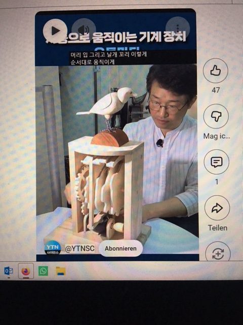 Sieht ganz nach Seung Hang Lee aus. Er ist der leitende Professor des Automata Korea Design Center in Seoul und hat uns schon oft mit Konstruktionen seiner Holzautomaten erfreut. In diesem Kurzvideo wird dieser in Gestalt und Bewegung sehr gelungene Vogel gezeigt. Sein elegantes Bewegungsprogramm steckt in den 4 Kurvenscheiben. Siehe auch diesen Screenshot: